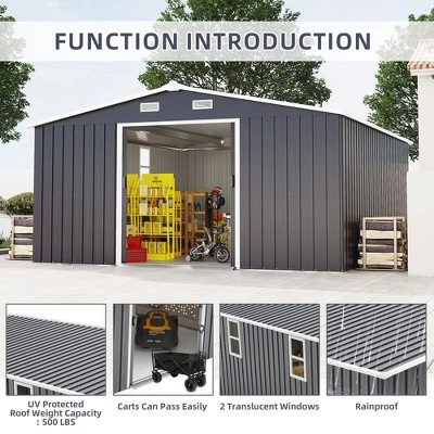 Extra Large Size10x12FT storage shed provides ample space for storing a wide variety of items, make it suitable be tool storage, bicycle shed, utility room, or pet house, storage capacity 876 Cubic FeetThe surface of the color steel plate is covered with a special protective film, which is carefully designed to show human care. In the transportation and installation links, it effectively prevents scratches, bumps and stains, just like wearing invisible armor for the steel plate, so that it is free from damage. After installation, easily remove the protective film, immediately show the color steel plate clean as a new bright appearance, always keep beautiful and clean, greatly extend its service life, so that your iron sheet room always exude charming charmMultifunctional useThe versatile outdoor storage shed is designed for multipurpose use, serving as a convenient garden storeroom, a cozy pet shelter, or an organized garbage collection chamber. It is perfect for the backyard, garden, or patio and serves as an excellent shed house optionThe Outdoor storage shed, measuring 9.5 x 11.91 FT, offers ample space(Internal capacity up to 560CU.FT) for all your outdoor storage requirements. This durable metal garden shed is applicable for storaging accommodate snow blowers, shovels, outdoor chairs, bicycles, and toy cars.Additionally, you can consider purchasing storage racks to optimize the organization of items such as shovels, umbrellas, antennas, escalators and more on this versatile outdoor storage solutionRugged 0.25mm color steel plateSelected 0.25mm thick high-quality color steel plate to build the main body, this thickness ensures that the iron house structure is stable and solid, with excellent impact resistance and pressure resistance. Whether it is dealing with the severe weather of howling winds and torrential rain, or to withstand the collision and wear of daily use, it can be as stable as Mount Tai, for you to protect the indoor space for a long timeWeights & Dimensionsstorage shed dimensions10*12FTColorGrayMaterialMetalProduct DimensionsW 138.97″*D113.77″*H79.52¡±Product door sizeW40.94″*H65.74¡±G.W251.76lbsN.W233.02lbsStyleBackyard Garden Tool ShedWater Resistance LeveWaterproofRoof bearing30kg per squareUltraviolet Light ProtectionYesAssembly RequiredYes
