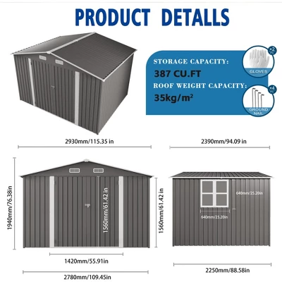 ¡¾Large storage shed¡¿: 120″ L x 96″W x 76.4″H for outdoor shed. This garden shed is perfect for storing snow blowers, lawnmowers, outdoor chairs, bikes, grills, generators, and any other tools. The double-door design easily allows an adult to enter the storage more easily.¡¾Sturdy Construction¡¿: our product is made of galvanized steel as a whole frame and the unique painting technology makes the shed UV-proof and the stored items will be kept intact.The sloping roof and bow-shaped design panels enhance the waterproof property. The overall structure is very sturdy.¡¾Multifunctional Occasions¡¿: We are committed to creating a well-organized garden for you. Our garden sheds can be used not only as an outdoor storage cabinet, but also as a pet house to provide a safe and warm place for your pets to live, also as a garbage, collection room to keep your backyard tidy.¡¾Doors & Windows¡¿: Keep important tools locked away; a lockable latch on double doors makes the metal garden shed an extra secure option for outdoor storage. Enjoy a shed that’s an accent. Not only does our tool storage shed include vent windows, but natural light via a cottage-style window as well.¡¾Easy Installation¡¿£ºEasy-to-assemble outdoor sheds on clearance, each part of the outdoor shed is clearly labeled with a part number, and it comes with a detailed step-by-step manual to ensure a smooth and hassle-free assembly process.