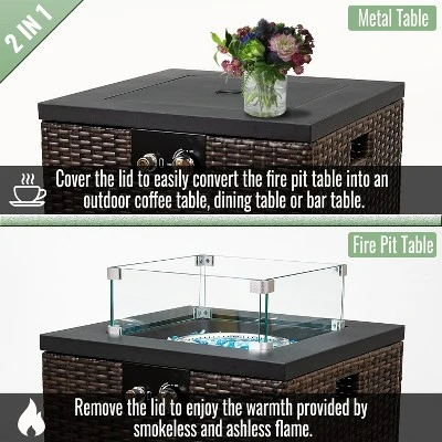 - Space-saving dual-purpose design: This 22-inch square fire pit table maximizes practicality in a compact space. It comes with a tempered glass wind shield and a durable waterproof rain cover, making it perfect for intimate gatherings, quiet evenings or casual outdoor dining.