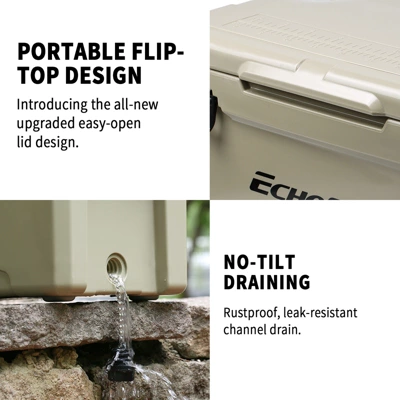 Product Features¢Ù ICE RETENTION: EchoSmile Rotomolded cooler keeps cold for up to 5 days with recommended 2:1 ice-to-contents. The intermediate insulation layer is made of polyurethane so as to provide superior insulative and high strength. The silicone sealing ring seals the whole space to avoid heat convection and prolong the cryopreservation time.¢Ú SIZE&WEIGHT: Our coolers offer a range of sizes and designs to meet different needs. Whether you need a small personal cooler or a large high-capacity model, we’ve got you covered. It will be a perfect tool to cool your drinks, such as beer, beverage,s and juice, etc. The cooler can withstand more than 310 lbs. You can sit or stand on the lid without worrying that it will be broken.¢Û STURDY ROTOMOLDED CONSTRUCTION: Solid rotary mold ice chests and coolers, with classic surface color and natural luster, use LLDPE material, which is safe & environmental-friendly, sturdy & anti-resistant, inside(food grade) and outside(UV resistance).¢Ü ALL DETAILS: Silicon tension latches do not break easily or come loose automatically. UV inhibitors protect the cooler against sun damage. Anti-slide rubber feet help to keep stable. 2 impact rubber absorbing ergonomic grips on each side help easier moving. The drain plug allows you to remove water without turning the cooler upside down.