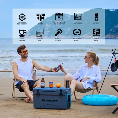 Product Features¢Ù ICE RETENTION: EchoSmile Rotomolded cooler keeps cold for up to 5 days with recommended 2:1 ice-to-contents. The intermediate insulation layer is made of polyurethane so as to provide superior insulative and high strength. The silicone sealing ring seals the whole space to avoid heat convection and prolong the cryopreservation time.¢Ú SIZE&WEIGHT: Our coolers offer a range of sizes and designs to meet different needs. Whether you need a small personal cooler or a large high-capacity model, we’ve got you covered. It will be a perfect tool to cool your drinks, such as beer, beverage,s and juice, etc. The cooler can withstand more than 310 lbs. You can sit or stand on the lid without worrying that it will be broken.¢Û STURDY ROTOMOLDED CONSTRUCTION: Solid rotary mold ice chests and coolers, with classic surface color and natural luster, use LLDPE material, which is safe & environmental-friendly, sturdy & anti-resistant, inside(food grade) and outside(UV resistance).¢Ü ALL DETAILS: Silicon tension latches do not break easily or come loose automatically. UV inhibitors protect the cooler against sun damage. Anti-slide rubber feet help to keep stable. 2 impact rubber absorbing ergonomic grips on each side help easier moving. The drain plug allows you to remove water without turning the cooler upside down.