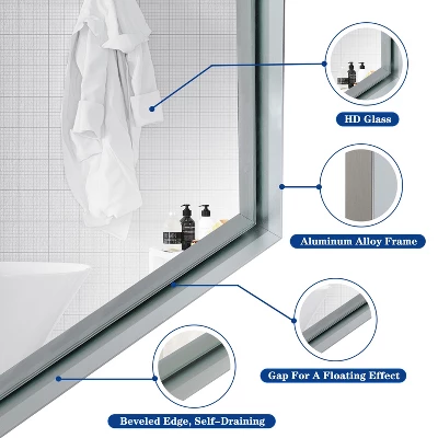 Beveled edgeNew design of beveled edge, more beautiful, automatic drainage, not hiding water stains.Location ruler (Horizontal & Vertical)With a ruler, the mirror is easy to install. the stand is strong enough to support the weight of the mirror. bathroom mirrors can be hung vertically or horizontally.Aluminum frameThe bathroom vanity mirror uses a high-quality aluminum alloy frame, which is rust resistant and does not deform.HD Bathroom MirrorWall-mounted bathroom mirror adopts HD float glass design to ensure 1:1 reproduction of the real image, providing clear reflection without distortion.40x30inch Silver Rectangle Wall MirrorInnovative design allows the glass to float in the middle of the 1.57inch metal frame, giving the mirror a more three-dimensional feel. we hope this new design of Rectangle mirror will be beyond classic and add a sense of luxury to your room.