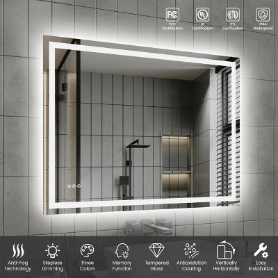 Room Type BathroomShape RectangleProduct Dimensions 48inx36inFrame Material AluminumStyle ModernMounting Type Wall MountFinish Type Mirror FinishSurface Recommendation WallSpecial Feature Moisture Resistant, Touch Sensor, FogColor Multi-colorTheme SpaceNumber of Pieces 1Number of Items 1Item Weight 23.5 Pounds