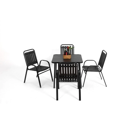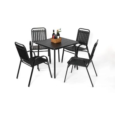 Outdoor & Indoor OccasionOur patio dining chairs set for 4 are not only suitable for outdoor garden lawn patio pool coffee time but also suitable for indoor kitchen living room dinner time. Simple and utility design is great for outdoor cozy leisure time with your family and friendsmetal steel frame with E-coatingmetal steel frame with E-coating ensures the longevity of this outdoor steel like dining table. Rust and weather resistant, brings you years of enjoyment, easy to cleanCOMFORTABLE SEATSLooking to experience outdoor leisure in style and comfort? This patio furniture set fits the bill; Ample seat space with thick cushions allows cozy parent-child time, as well as great snuggling with your pet; Cushion cover is detachable for easy maintenance.EASY ASSEMBLY & RELIABLE SERVICEConvenient assembly only takes a few minutes by following the instructions with all parts included; Our excellent pre- and after-sales services are always available to ensure your purchase is hassle-free5-Piece Plastic chair and steel table Outdoor Dining Set-BlackColorBlackChair22.05″ L x 24.80″ W x 35.43″ HTable31.50” L x 31.50” W x 28.74” HRecommended Uses For ProductOutdoor, Relaxing,GardenFrame MaterialBlackPackage Size/Weight1SET/2CTNSBOX 1: 34.25”x 34.25”x 2.36” / 24.69 lbBOX 2: 39.37”x 26.77”x 7.09” / 46.74 lbOverall Product Weight71.43 lbPieces Included1 Table+4 chairsTable Top MaterialsteelTable Top ColorBlackPackage Number2County of OriginCHINA