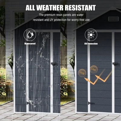 [Robust Construction] Nothing irks a garden hobbyist more than the sight of a collapsed shed. Luckily, this shed utilizes galvanized iron frames which greatly increase the overall sturdiness. On top of that, the galvanized steel panels, coated with eco-friendly painting, can endure harsh weather for at least 6 years.[Punched Vents] Unlike typical sheds with plastic vents, this shed comes with four integrated punched vents which will not deteriorate against sunlight.[Sliding Doors and Padlock] Pad-lockable sliding doors for easy entry and exit. A heavy-duty complimentary padlock grants extra safety.[Easy to assemble] DIY assembly with pre-cut and pre-drilled parts for your convenience.The uniquely designed frames provide not only extra sturdiness but also a smooth assembly process. No experience is needed to finish the shed.[Gift Tool] Metal Foundation Frame,Anchors,Hooks,Shelf,Lock(padlock),Gloves Easy-build shed made of Electro Galvanized Steel treated for strong corrosion resistance. UV resistant steel panels protect against rot, insects, and extreme weather conditions.Product Highlights