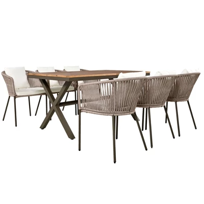 DescriptionIntroducing our meticulously crafted outdoor dining set, comprising a rectangular table and six chairs designed to elevate your dining experience. Crafted with a robust iron frame and acacia wood tabletop, the table exudes durability and sophistication. The ergonomic chairs boast a curved backrest for optimal comfort and support, complemented by plush seat cushions and back pillows for a luxurious seating experience. Equipped with adjustable feet, both the chairs and table ensure stability on any outdoor terrain, making them perfect for backyard barbecues or serene garden picnics. With its classic beige rope weaving, this set adds a contemporary flair to any outdoor space, seamlessly blending style and functionality for any setting.Weight CapacityChair250 lbsTable150 lbsNet WeightChair12 lbsTable48 lbsAssemblyPillows IncludedYesRemovable PillowsYesRemovable CushionsYesWith ZipperYesAdult Assembly RequiredYesAssembly TimeAbout 40 minutesMaterialRope + Polyester + Foam + Iron