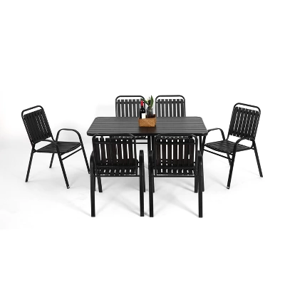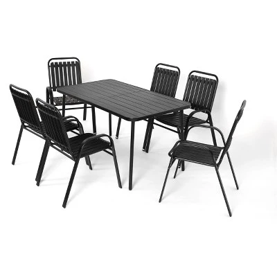 Outdoor & Indoor OccasionOur patio dining chairs set for 6 are not only suitable for outdoor garden lawn patio pool coffee time but also suitable for indoor kitchen living room dinner time. Simple and utility design is great for outdoor cozy leisure time with your family and friendsmetal steel frame with E-coatingmetal steel frame with E-coating ensures the longevity of this outdoor steel like dining table. Rust and weather resistant, brings you years of enjoyment, easy to cleanCOMFORTABLE SEATSLooking to experience outdoor leisure in style and comfort? This patio furniture set fits the bill; Ample seat space with thick cushions allows cozy parent-child time, as well as great snuggling with your pet; Cushion cover is detachable for easy maintenance.EASY ASSEMBLY & RELIABLE SERVICEConvenient assembly only takes a few minutes by following the instructions with all parts included; Our excellent pre- and after-sales services are always available to ensure your purchase is hassle-free7 Pieces Patio Dining Set, Plastic chair and steel table Outdoor Set-BlackColorBlackChair22.05″ L x 24.80″ W x 35.43″ HTable54.92” L x 31.50” W x 28.74” HRecommended Uses For ProductOutdoor, Relaxing,GardenFrame MaterialBlackPackage Size/Weight1SET/2CTNSBOX 1: 36.65”x 30.71”x 5.51” / 48.50 lbBOX 2: 39.37”x 26.77”x 9.45” / 60.63 lbOverall Product Weight109.13 lbPieces Included1 Table+6 chairsTable Top MaterialsteelTable Top ColorBlackPackage Number2County of OriginCHINA