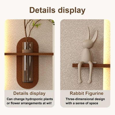 ELEGANT GREEN 3D DESIGN ¨C Bring nature indoors with this stunning wall decor, featuring a meticulously crafted glass vase and lifelike artificial green plants. Its striking 3D effect adds depth and vibrancy to any space. Customize the arrangement by adding your favorite plants for a personalized touch.HIGH-QUALITY HANDMADE MATERIALS ¨C Constructed from durable multi-layered sandstone with a frosted handmade texture, this piece showcases rich colors and intricate details. Each element highlights the harmony of natural beauty and expert craftsmanship.DIY Design – The hydroponic glass bottle can be used to grow your favorite plants or flowers, and you can freely combine them. There is also a rabbit figurineAdjustable Soothing LED Lighting ¨C Customize your ambiance with remote-controlled three-color temperature and brightness settings. Enhanced by soft ambient LED lights, this decor creates a calming atmosphere to reduce visual stress. Perfect for unwinding at night, it also doubles as a gentle night light to elevate your room¡¯s mood.EASY TO INSTALL ¨C Designed for hassle-free setup, the included mounting hardware ensures quick installation. Its lightweight build allows you to effortlessly reposition it to refresh your space anytime.VERSATILE HOME DECOR ¨C Ideal for living rooms, bedrooms, or any area needing a natural accent, this decor complements a wide range of interior styles. Let it transform your space into a serene, stylish retreat.Equipped with a USB interface-No socket installation is required, ensuring the integrity of the wallMade of PVC-The product is made of high-quality PVC, which is not easy to deform or get damp, and also protects the health of your family