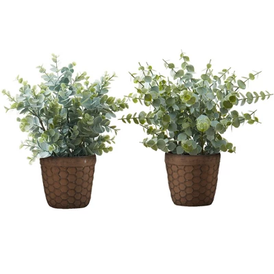 Add a touch of greenery to your home or office space with this set of 2, indoor only artificial eucalyptus grass plants up to 13″ tall.Conveniently set in 5″ cement brown pots, these decorative faux plants have adjustable variegated green leaves that can be arranged for a full, natural look.These easy-care, potted artificial plants are made from the highest quality materials and require no maintenance or watering, for a sustainable, environmentally friendly decorative accent that will last a lifetime.Product dimensions: 11.5 in. L x 11.5 in. W x 12.5 in. H; 11 in. L x 11 in. W x 12 in. H