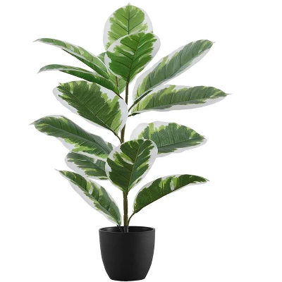 Add a touch of greenery to your space with this 27″ Tall Artificial Rubber Plant that is set in a 5″ black potThis artificial plant features 15 lifelike two toned green leaves with white tips that are easily adjustable and feel realThis easy-care, indoor faux floor plant is made from the highest quality materials and requires no maintenance or watering, for a sustainable, environmentally friendly decorative accent that will last a lifetimeNo assembly required; product dimensions: 21 in. L x 20 in. W x 26.5 in. H