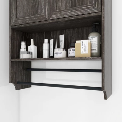 - Space-Saving: Suitable size and large capacity. Wall mounted design gives you deep storage without taking up extra space, open storage shelf saves your time, hidden design prevents dust and protect your privacy, keeping everything in order behind the doors with its spacious interior.Two towel racks are installed below the cabinet, and a paper rack is installed on the side to provide more storage space.