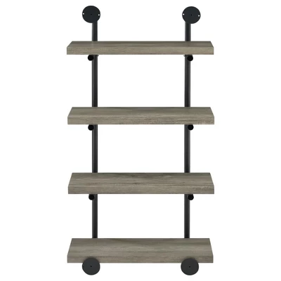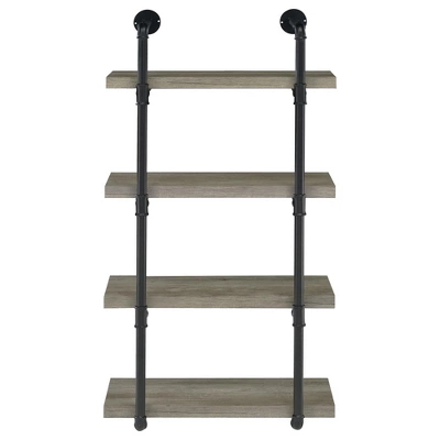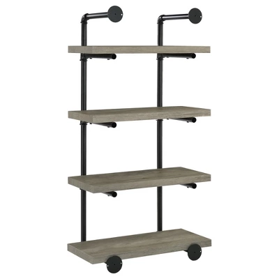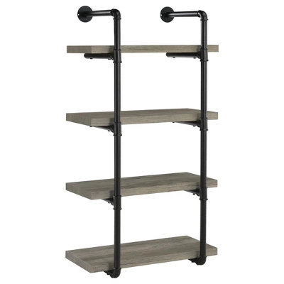 Romance CopyThis industrial style wall-mounted shelf features planks supported by a pipe-like metal frame. Hang this shelf on a lakeside cabin living room wall to display family photos or book collections.Product DetailsSet includesOne (1) wall shelfDimensions46 inches high x 23.5 inches wide x 11.5 inches deepFinish ColorBlack and Grey DriftwoodMaterialsMetal, MDF, particle board and laminate