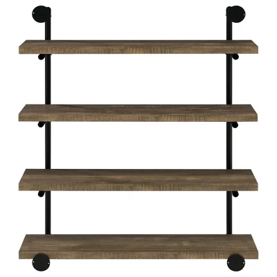 Romance CopyWith plank shelves supported by a pipe-like metal frame, this shelf is an industrial marvel. Hang this shelf on a lakeside cabin living room wall to display family photos or book collections.Product DetailsSet includesOne (1) wall shelfFinish ColorBlack and Rustic OakDimensions45.5 inches high x 39.25 inches wide x 11.5 inches deepMaterialsMetal, MDF, particle board and laminate