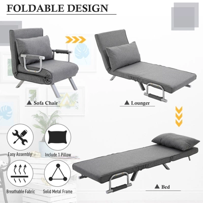 Modern Stylish Design: The minimal sofa chair design, with a single color block cushion, metal fixtures, and accent pillow, will fit into most home decor settings.5 Adjustable Backrest Angles: The five-position backrest offers multiple levels of adjustment to help you find the perfect, relaxing seating angle of this futon sofa bed.Folds Down Into A Bed: This convertible sofa bed can be changed into a comfortable sofa, a laid-back lounge, or a cozy bed to meet your various needs.Stable and Sturdy: A high-quality powder-coated steel frame creates a sturdy, relaxing base while the suede Polyester cover over medium density Polyester, adds a luxurious, comfortable touch to the futon chair bed.