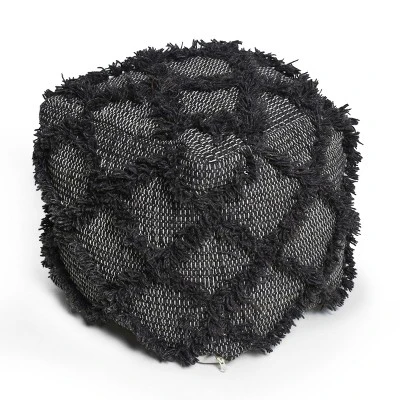 Material: Fabric Composition: Wool and Cotton.It is a one of a kind indoor Pouf.16x16x16 inches square.Capacity 200 pounds.Fully assembled.Filled with polystyrene beads.
