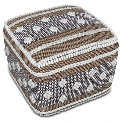 DIMENSIONS: 18inD x 18in W x 14in HHandcrafted with Handcrafted with 100% recycled PET woven polyester in a white, beige and grey patternSturdy and structured using dense polystyrene bead filling that helps keep its shape and is super supportiveMulti-functional can be used on your patio, deck, in your living room, family room, bedroom as a foot stool, accent furniture or provide additional sittingWater and UV Ray resistant, versatile square shape made of 100% recycled PET obtained from recycling of PET bottlesFully assembled