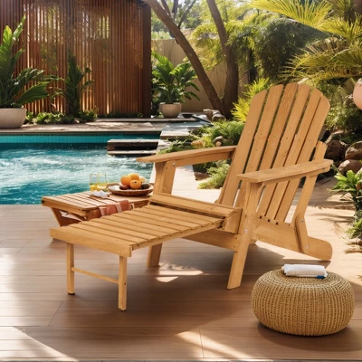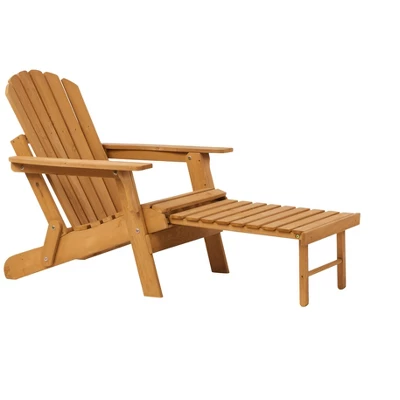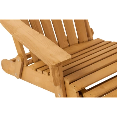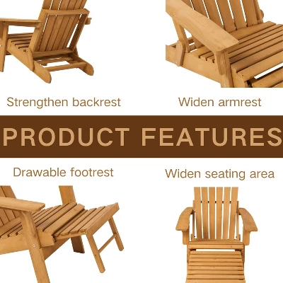 Premium Material: Our wooden patio Adirondack Chair is crafted from carefully selected solid wood and coated with non-VOC, water-based paint, offering a sustainable choice for outdoor seating.Built-in Footrest: Designed for relaxation, the outdoor chair includes a built-in footrest that easily extends, allowing you to fully stretch out for enhanced comfort.Space-Saving Design: The oversized lounge chair combines ergonomic comfort with a foldable, one-step design for effortless storage and transport. Lightweight and portable, it¡¯s the ideal space-saving solution for any outdoor setting.Ergonomic Comfort: The firepit chair¡¯s backrest and footrest are ergonomically designed to provide maximum support, ensuring comfort even during long periods of use.Easy Assembly: Enjoy a quick and simple setup. With the seat and backrest partially pre-assembled. Chair dimensions: 54″D x 31″W x 33.5″H; Max. Weight Capacity: 350 lbs.