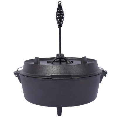 Pre-Seasoned Cast Iron Dutch Oven for Camping: This sturdy dutch oven is designed to withstand extreme outdoor environments, making it perfect for all your camping adventures.Versatile Lid: The lid, equipped with legs, doubles as a skillet or griddle, allowing you to enjoy frying foods even while camping. Its multifunctional design enhances your outdoor cooking experience.Ideal for Outdoor Gatherings: Perfect for a day out with friends or family, this dutch oven allows you to cook a variety of outdoor foods that will satisfy everyone’s tastes.Easy to Transport and Hang: The built-in carrying handle makes it easy to transport, and it can be easily hung from a tripod stand on flat surfaces, ensuring convenient and versatile cooking options.Safety and Convenience: For your safety and convenience, we provide a dutch oven lid lifter, making it easier and safer to handle the hot lid during your cooking.
