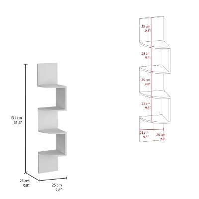 Four Shelving Units: Offers four 9.8″W x 9.8″H shelves, perfect for a variety of decorative displays.Full-Wall Assembly: Seamless wall integration for a clean, floating appearance.Contemporary Finishes: Available in multiple finishes.Corner-Friendly Design: Specifically engineered for wall corners, maximizing space and adding a modern touch.Corner-Friendly Design: Specifically engineered for wall corners, maximizing space and adding a modern touch.Decor and setting objects are not included.