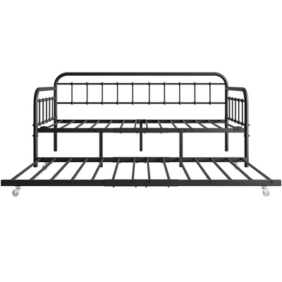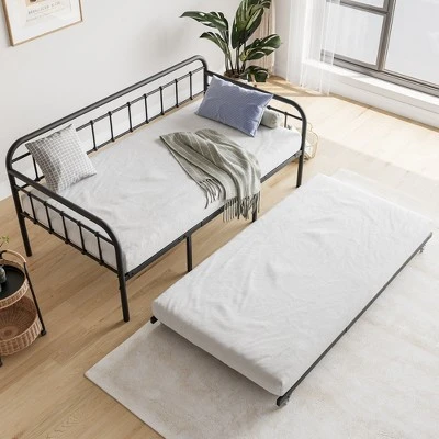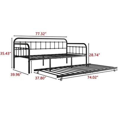 Product DescriptionElevate your living space with this stylish and versatile Metal Frame Daybed with Trundle. Designed to effortlessly blend with any decor, this daybed is perfect for a guest room, small apartment, or even a cozy nook in your home. Crafted from a sturdy metal frame, this daybed is both durable and elegant, offering a timeless look that never goes out of style.SpecificationsMaterialMetalDimensionsDaybed – 77.72″ L x 39.96″ W x 35.43″ H; Trundle – 74.2″ L x 37.8″ W x 4″ HWeight CapacityDaybed – 400 lbs; Trundle – 300 lbsAssemblyRequiredIncluded1 x Metal Frame Daybed1 x Trundle1 x Set of Assembly Hardware1 x Assembly Instruction Manual